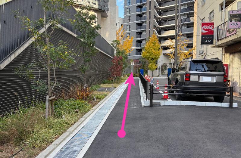 広場の左側にある通路を道なりに進みます。